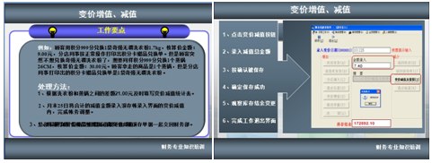 2012年4月25日公司培训部总结了分店财务工作的经验,对部分在此方面操作失误较多的店长开展了《关于变价增值与减值的操作规范》培训,本次培训,通过典型的案例及虚拟的动态程序反复演练,解决了这些分店干部的疑惑,提升了她们的工作技能,对提升分店销售起到了积极的推动作用。